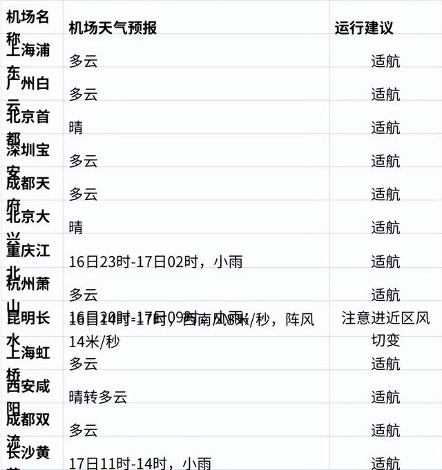 预计16日中午至17日中午,内蒙古中部、辽宁、河北、北京、天津、山东、江苏、安徽北部、河南东北部等地的中低空空域有轻到中度颠簸;新疆北部、内蒙古东北部、黑龙江、吉林、四川东部、陕西、重庆、河南西南部、湖北、湖南北部、安徽西南部、江西北部等地的低空空域有积冰条件。
