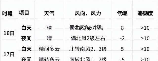 预计,16日北京地区天气为晴,能见度好;白天有3、4级偏北风,阵风可达7级左右,夜间风力减弱至2级左右;气温较昨日下降,白天最高气温8℃,夜间最低气温-2℃。17日天气晴转多云,风力不大;白天最高气温5℃,夜间最低气温-5℃。具体天气预报见附表。