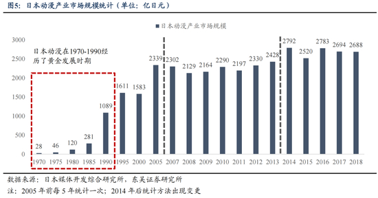 同一时期,在经济繁荣,科技快速发展的背景下,日本的动漫IP也迅速崛起。1970年代,《哆啦A梦》、《高达》、《龙珠》等漫画陆续被创作,并被搬上电视,日本动漫产业迎来黄金发展期。1975年日本动漫产业市场规模仅有46亿日元,但到1990年便突破千亿规模。优质的动漫IP风靡全球,成为日本文化的重要输出载体,有力地提升了日本的国际影响力。同时,日本股市在经济繁荣的推动下也表现强劲,日经指数在1980年代末达到高位。