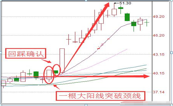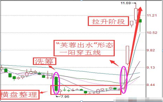 一根大阳线上穿三条均线,均线为多头排列,后势看涨,称作“一阳穿三线”。“芙蓉出水”是K线与均线结合的产物,指横盘整理或下跌过程中,某一根长阳线突破短期均线系统(如5日、10日、20日均线),即形成芙蓉出水。它的原理是股价一浪建仓后进行二浪平台整理洗盘,然后放量突破走主升浪,且底部横盘时间长,在突破前主力有强力洗筹动作。