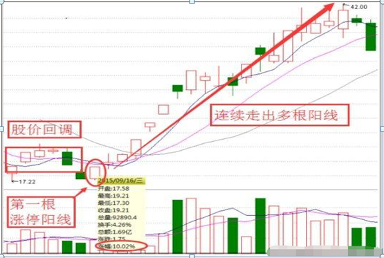 该个股股价经过充分回调后,反弹后的第一根阳线为涨停板,此后股价连续攀升。