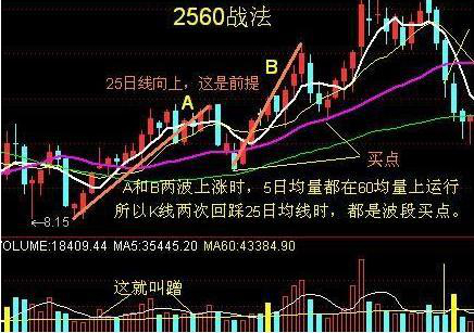 他用的是摆脱厄运远离亏损的2560战法,在他的专著里透露这个方法其实非常简单——25日均线坚决向上,5日均线上穿或回踩25日均线时,成交量5均量大于60均量就是介入机会,最好此时出现缩量小星线过渡: