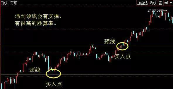 遇到颈线的情况通常会形成较强支撑,可以再等个一两天,支撑不被突破,即可大胆介入。(参考图四)