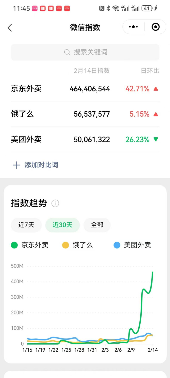 自京东外卖官宣以来,其微信指数急速飙升。2月14日,“京东外卖”微信指数达4.64亿,是“饿了么”微信指数的8.21倍、“美团外卖”微信指数的9.28倍。