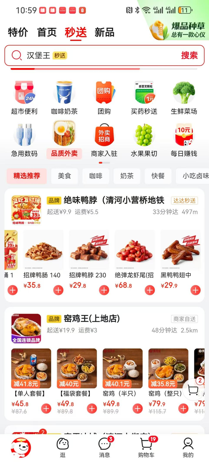 “秒送”专区C位是“外卖招商”,点击后商家即可入驻。