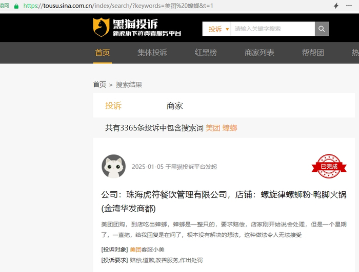 今年2月16日,雷达财经以“美团+蟑螂”为关键词,在黑猫投诉上搜索出3365条结果。