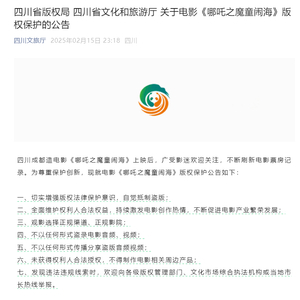 四川成都造电影《哪吒之魔童闹海》上映后,广受影迷欢迎关注,不断刷新电影票房记录。为尊重保护创新,现就电影《哪吒之魔童闹海》版权保护公告如下: