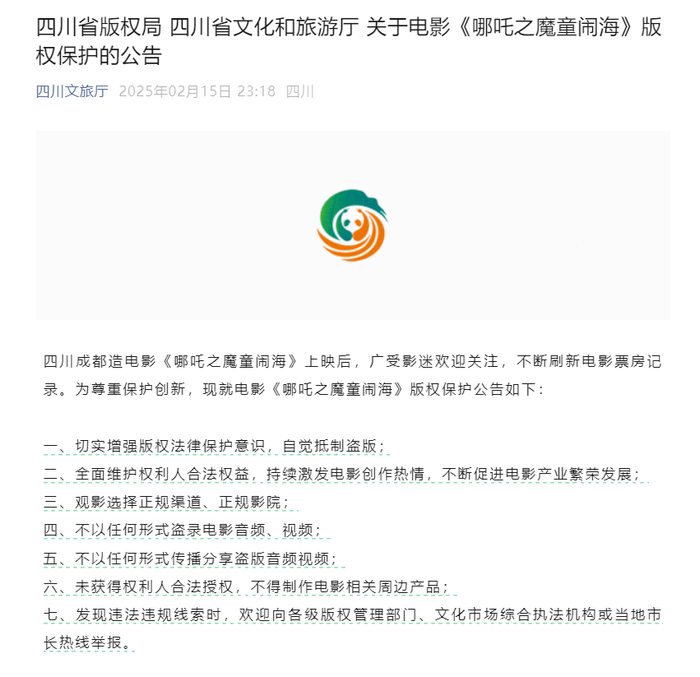 四川省版权局 四川省文化和旅游厅 关于电影《哪吒之魔童闹海》版权保护的公告