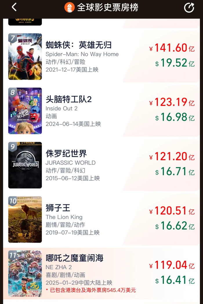 据网络平台数据显示,截至16日晚间20时,影片《哪吒之魔童闹海》总票房(含预售)突破118亿元,在全球电影票房排行榜上暂列第11位,当前的全球电影票房排行榜第十名为《狮子王》。