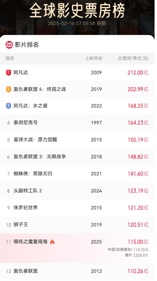 截至今早8时许,《哪吒2》总票房突破115亿,距离全球影视票房榜第十名只差5.5亿,很有可能今天《哪吒2》将进入全球影视票房榜前10。
