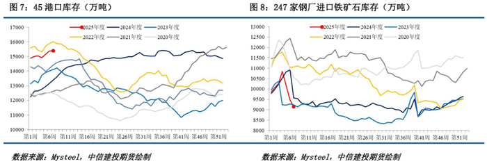 四、铁矿石库存:本期45港铁矿石库存增长,钢厂进口矿库存环比下降