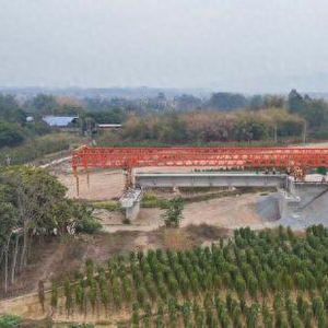 柳梧铁路金田跨平武高速特大桥首片T梁顺利架设