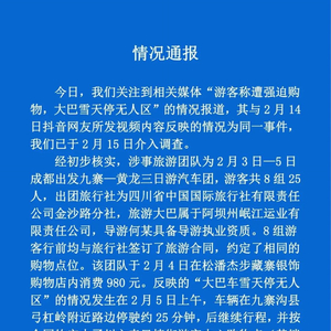 今日,我们关注到相关媒体“游客称遭强迫购物,大巴雪天停无人区”的情况报道,其与2月14日抖音网友所发视频内容反映的情况为同一事件,我们已于 2 月 15 日介入调查。