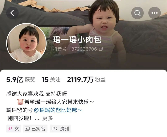 公开资料显示,“瑶一瑶小肉包”,本名杨亦瑶,2020年10月30日出生, “瑶一瑶小肉包”账号为其父母创办,是一个亲子类账号,主要记录4岁女孩“瑶一瑶”的生活日常。之后,“瑶一瑶”因为无缝变脸的表情包走红网络,拥有胖嘟嘟的脸蛋、软萌可爱的“瑶一瑶”也逐渐收获大量粉丝。
