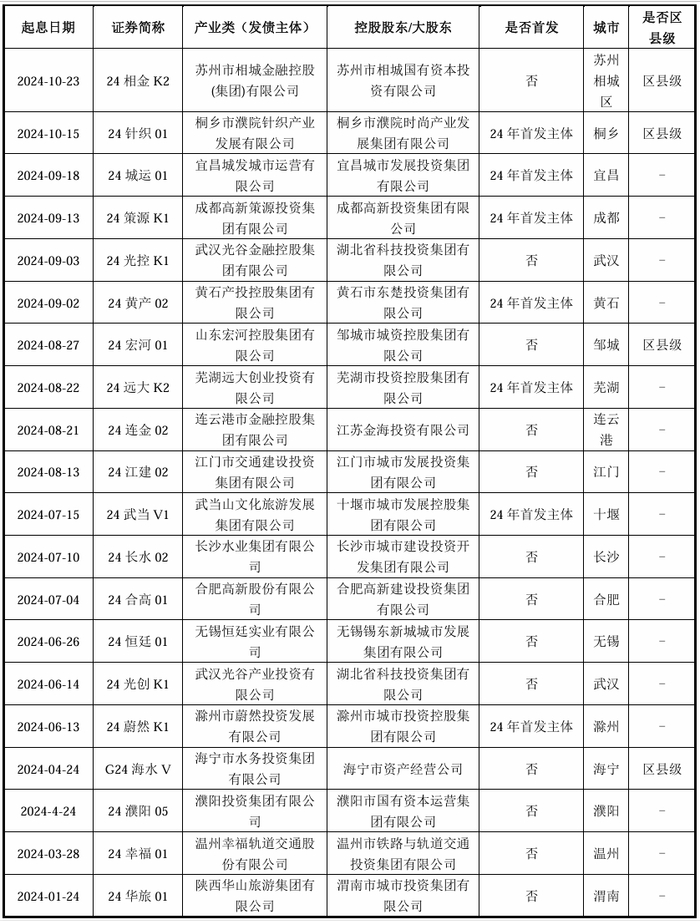 24年以来,城投产业类子公司实现债券首发和新增明细
