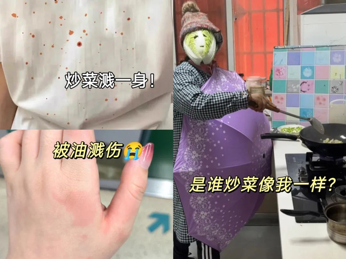 每次用普通铁锅炒菜,油星子满天飞像放鞭炮,身上包的只剩个眼睛才安心。一滴油溅手上钻心疼,溅衣服上还洗不掉,太难了!