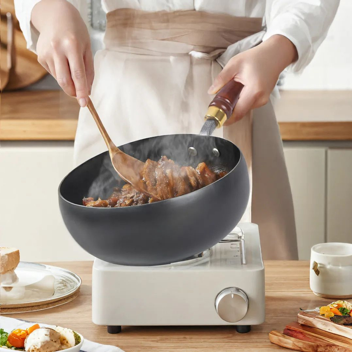 21cm防烫木手柄,握感舒适,手握处凹形小设计,更易于抓握煎炒,防烫防滑~