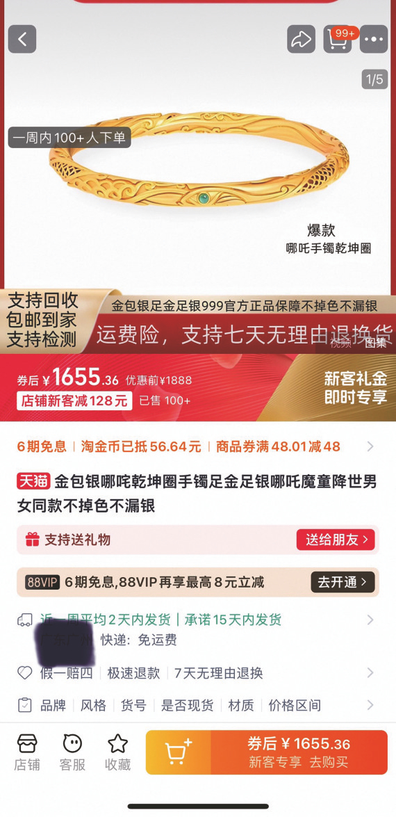 由于目前黄金价格较高,不少消费者购买“平替版”哪吒乾坤圈同款手镯。记者搜索发现,某电商平台一家银饰店的哪吒乾坤圈同款手镯售价368元左右。一家金包银店铺的哪吒乾坤圈同款手镯价格为1655元左右,商品详情显示产品约含黄金1.5克,目前已售出“100+”单,但客服表示并未获得版权。