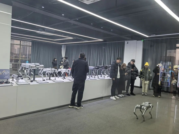 与DeepSeek高大上的办公环境不同,宇树科技显得颇为不起眼,同一栋大楼的标识牌上,一边是宇树科技,另一边是另一家机器人公司。记者到达时,宇树科技工作人员正在演示四足机器人的强大功能,展厅陈列着不同型号的机器人。