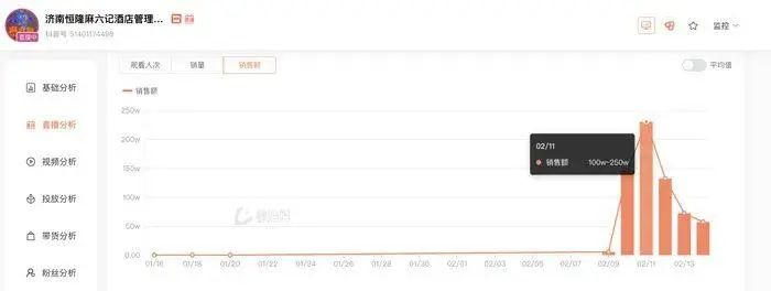 数据显示,9日、10日直播间观看人次分别为101.2万、387.9万;11日达到481.6万,为近几日最高;12日、13日、14日分别为372.3万、299.7万、253.3万,逐渐呈下滑趋势。而销售额方面,也在11日达到峰值,随后几天则从100万元—250万元下降到75万元—100万元区间。