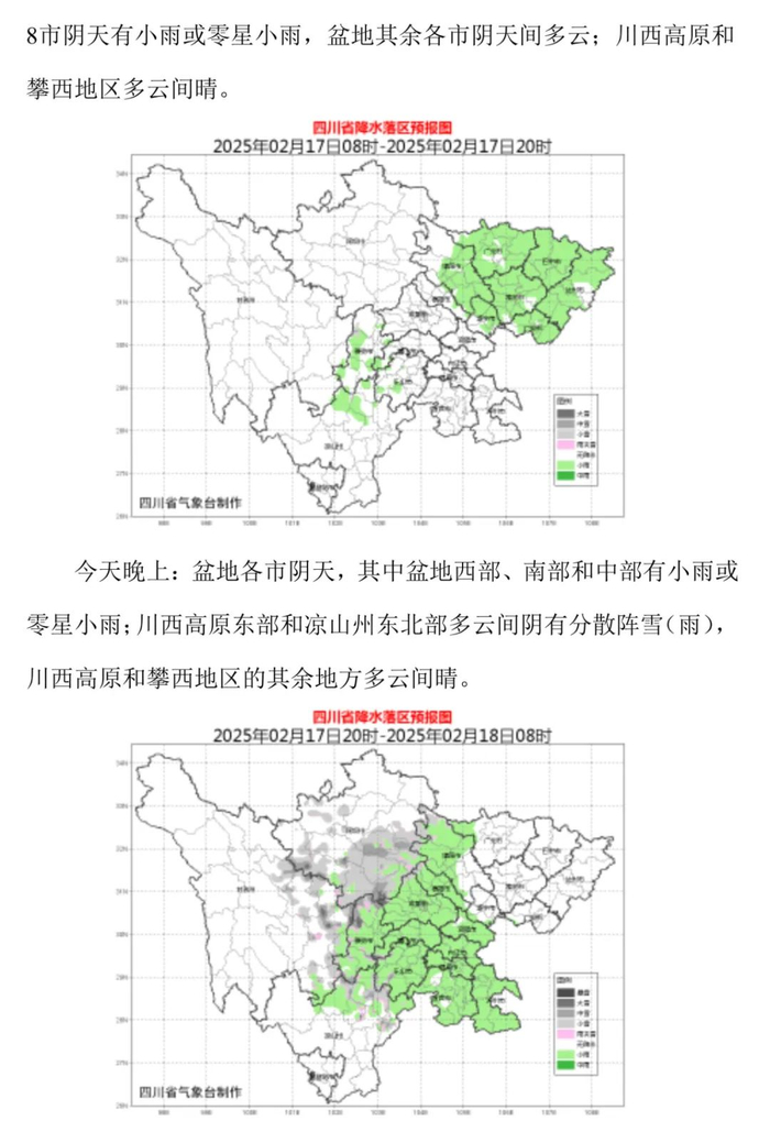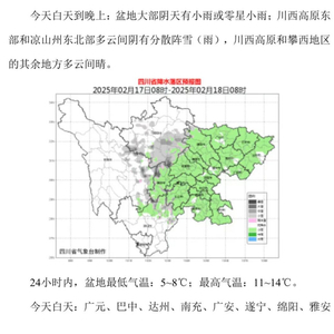 据四川气象消息,未来三天,盆地大部地方有小雨或零星小雨,川西高原北部多阵雪(雨),需防范盆地高海拔山区及高原雨雪天气和道路结冰对交通运输带来的不利影响;川西高原南部和攀西地区大部以多云间晴天气为主,森林火险气象风险等级较高,需加强火源管理和森林防火工作。