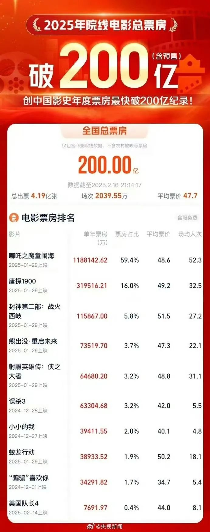 据网络平台数据,截至今日21时14分,2025年度大盘票房(含预售)突破200亿,刷新中国影史年度票房最快破200亿纪录!(央视新闻)
