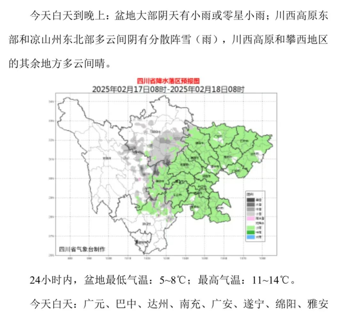 24小时内,盆地最低气温:6~9℃;最高气温:12~14℃。