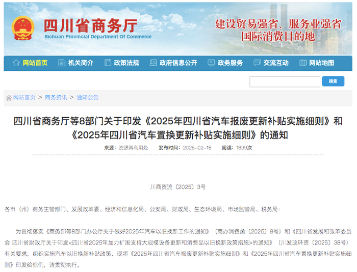 四川印发《2025年四川省汽车报废更新补贴实施细则》