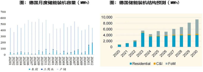 德国:2024年新增装机5.5GWh,同比-7%;户储下滑约15%,大储起量。