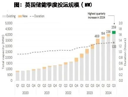 量的维度:并网排队问题导致英国2024年前三季度新增投运水平同比低于去年同期;预计共址储能有望推动2025年新增投运量增。2024Q1-3共计新增投运679MW;其中2024Q3电池储能新增投运规模为2024年以来单季最高(259MW);截至2024Q3英国共计4.3GW/5.8GWh的电池储能投入商业运营,平均配储时间为1.33h。业主和开发商表示,英国2024年前三季度新增投运同比低于2023年同期水平,主要系配电网运营商调度问题以及并网排队导致。根据Modo Energy预计,差价合约(CfD)计划拍卖中的积累共址储能项目有望在2025年上线并网。