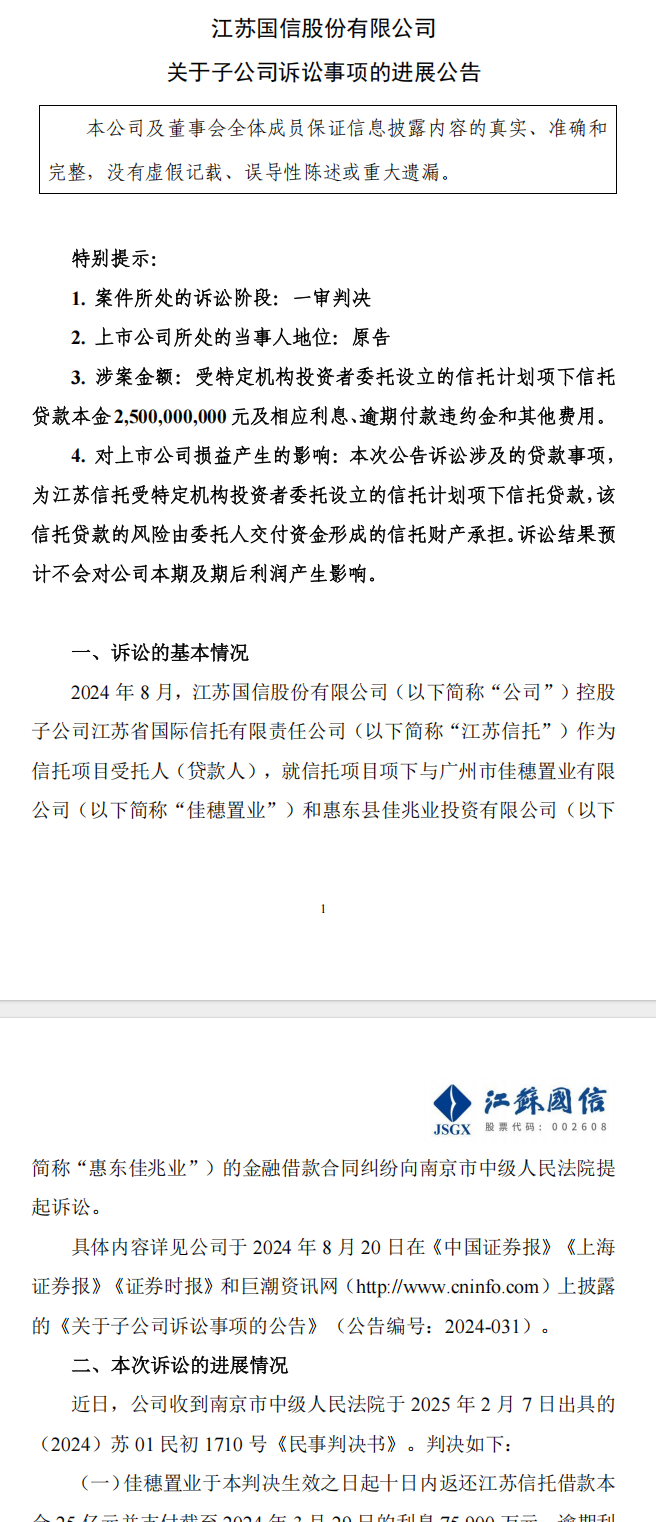 2024年8月,江苏国信股份有限公司(以下简称“公司”)控股 子公司江苏省国际信托有限责任公司(以下简称“江苏信托”)作为 信托项目受托人(贷款人),就信托项目项下与广州市佳穗置业有限公司(以下简称“佳穗置业”)和惠东县佳兆业投资有限公司(以下简称“惠东佳兆业”)的金融借款合同纠纷向南京市中级人民法院提 起诉讼。