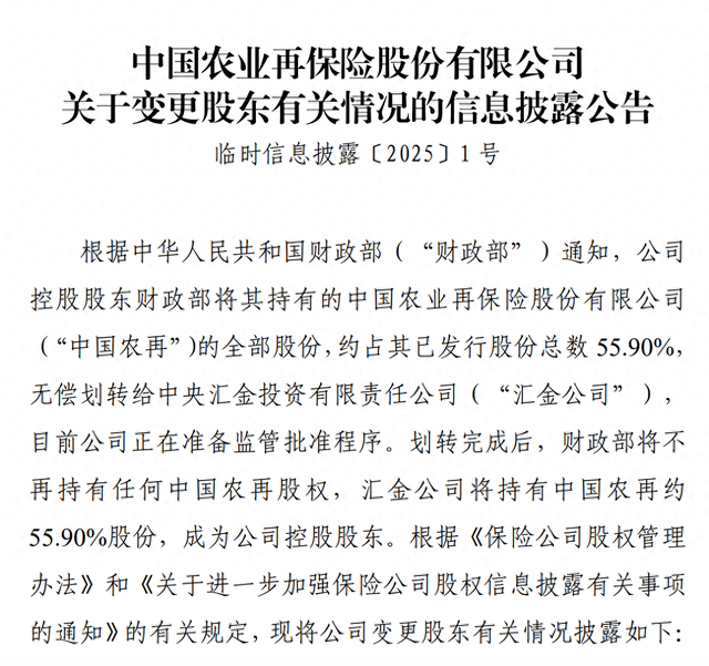 中国农业再保险将变更股东,55.9%股份划转给汇金公司