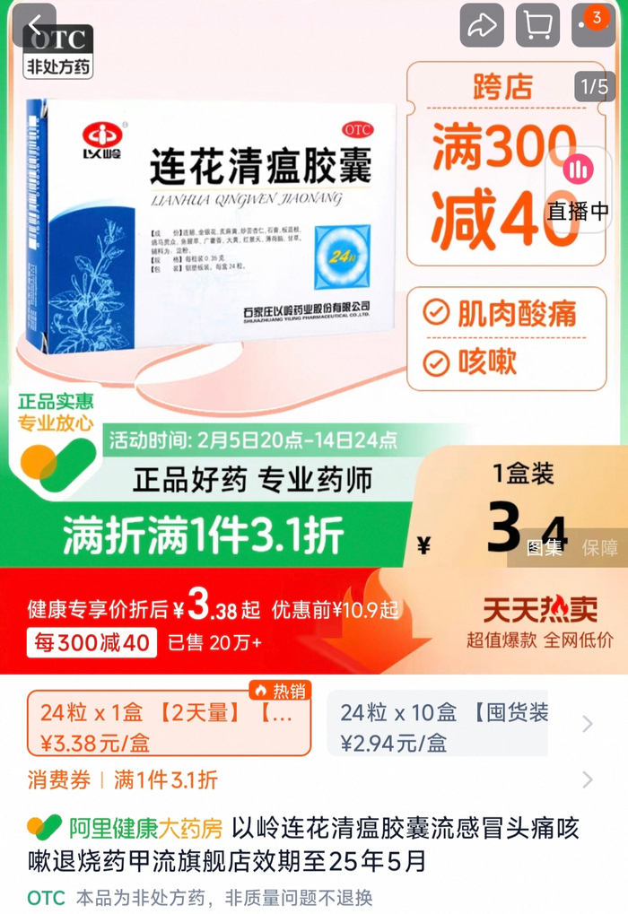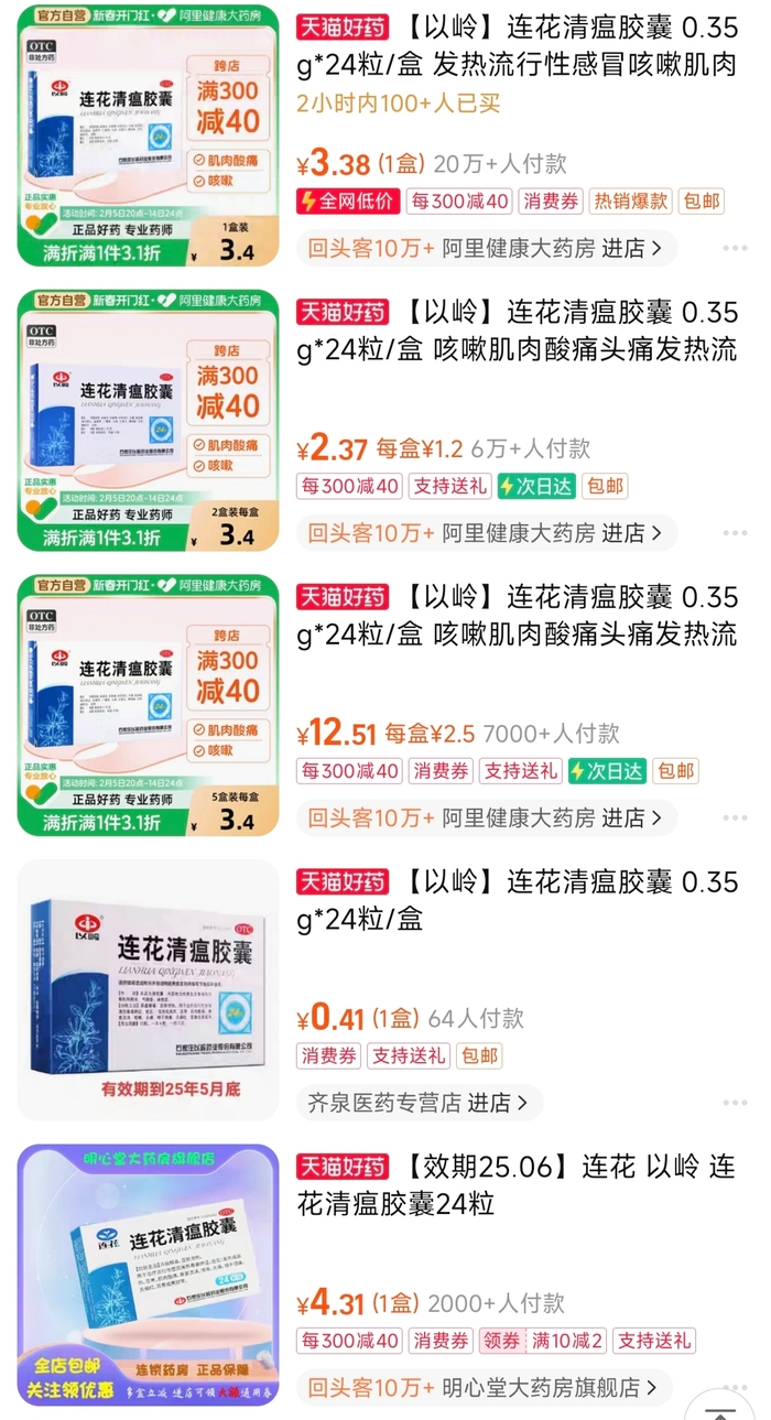 笔者在淘宝上搜索“连花清瘟胶囊”发现,有很多药房正在“甩卖”效期至2025年5月的产品,一盒24粒装的连花清瘟胶囊折后价在3.4元左右,还有一盒低至不到1元。