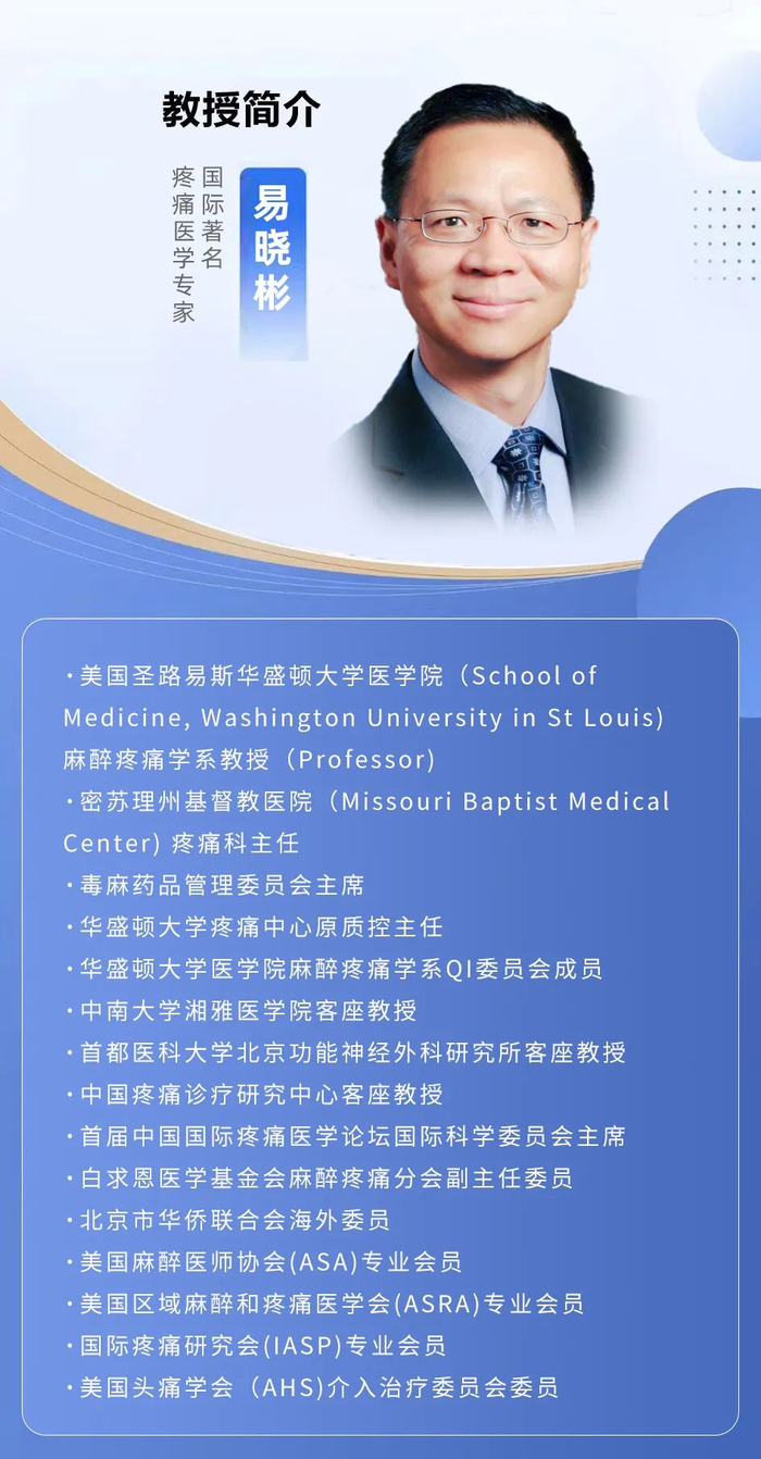易教授在临床疼痛医学方面造诣颇深,对复杂性区域性疼痛综合症(CRPS)的诊断和治疗,头颈疼痛,神经病理性疼痛,肿瘤镇痛,椎体成形术,后突成形术,微创椎板减压术,腰椎管狭窄减压术(Verteflex), 椎体疼痛射频治疗,神经㨄控(SCS & PNS)和蛛网膜下腔给药技术(ITP)等疼痛治疗方面心得独到。