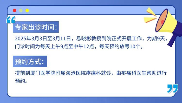 国际知名疼痛学专家、美国圣路易斯华盛顿大学医学院贝恩斯医院疼痛中心主任易晓彬教授从2016年作为该院的特聘专家,开始定期来厦诊疗,为厦门及周边,乃至全省、全国的特殊疑难疼痛患者提供国际化的诊疗服务,同时将国际领先的医疗技术和前沿的医疗理念承接植入到科室,推动学科、人才、服务、技术的全面高速发展。