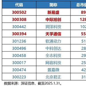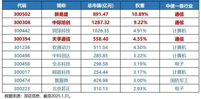 根据深证信息,截至2025年1月末,创业板人工智能指数前十大重仓股分别为新易盛、中际旭创、润泽科技、天孚通信、软通动力、中科创达、全志科技、网宿科技、景嘉微、北京君正,合计权重为49.58%。