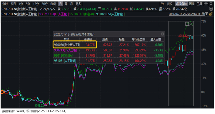 今年以来, AI主题行情已由低点完成一轮“V”型逆转。据Wind统计数据显示,截至2月14日,创业板人工智能指数自本轮AI主题行情低点(1月13日)以来累计反弹24.07%,表现优于同期人工智能、CS人工智、科创AI等AI主题指数,呈现出更强的弹性优势。