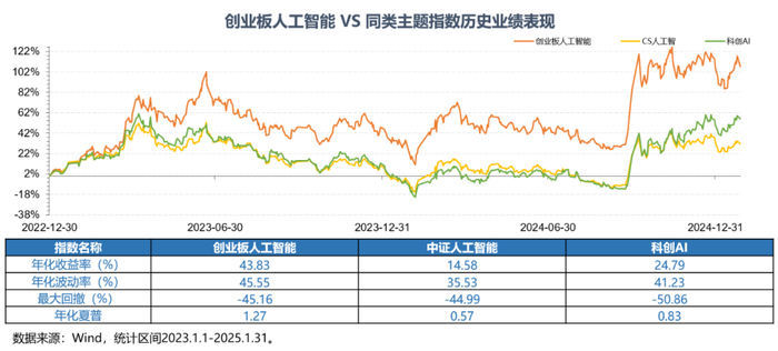 2023年以来,创业板人工智能指数收益显著跑赢同类主题指数。Wind统计数据显示,2023.1.1-2025.1.31期间,创业板人工智能指数累计涨幅为107.46%,同期科创AI指数、中证人工智能主题指数累计涨幅分别为55.99%、31.42%。截至2025年1月末,创业板人工智能指数市盈率(PE)在经历了前期上涨后位于过去五年70.83%的分位数,仍处于相对合理区间。