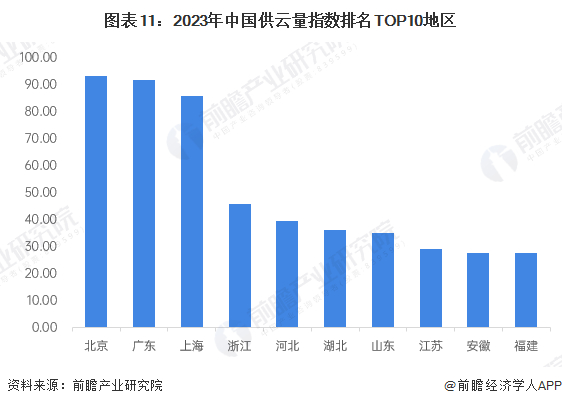 根据中国信通院测算,我国31个省(自治区、直辖市)云计算对用户可供给vCPU核数超过10亿个,云存储规模超50EB。其中,北京市供云量领跑全国,其次是广东、海上、浙江等地。