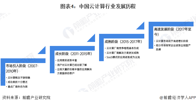 中国云计算的发展先后经历四个阶段:第一阶段为市场引入阶段,云计算的概念刚刚在中国出现,客户对云计算认知度较低;第二阶段为成长阶段,用户对云计算已经比较了解,并且越来越多的厂商开始踏入这个行业;第三阶段是成熟阶段,这个时候云计算厂商竞争格局已经基本形成,厂商们开始从更加成熟优秀的解决方案入手,SaaS模式的应用逐渐成为主流;第四个阶段是高速增长阶段,在这个阶段我国云计算市场整体规模快速增长,从细分领域来看,行业领军企业逐渐出现国产品牌身影。