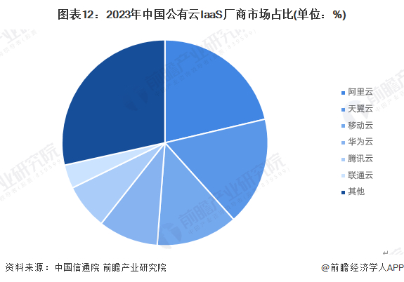 从公有云IaaS厂商层面来看,运营商强势增长引领新一轮市场发展。据中国信息通信研究院数据,2023年,阿里云、天翼云、移动云、华为云、腾讯云、联通云占据中国公有云IaaS市场份额前六,上述六大企业市场份额占比71.5%,比2022年下降了六个百分点,头部企业市场集中度有所下降。