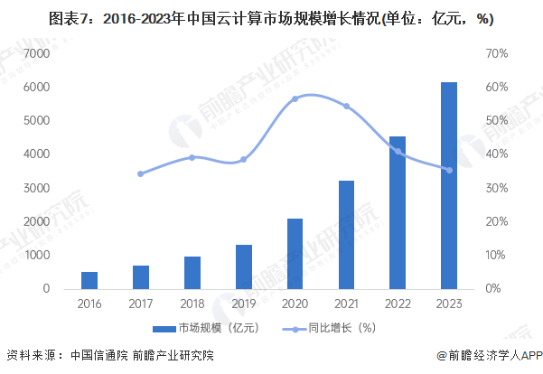 据中国信息通信研究院披露的数据显示,2016-2023年期间,我国云计算行业的市场规模增速均在30%以上,呈高速增长态势。2023年我国云计算市场规模达6165亿元,同比增长35.5%。