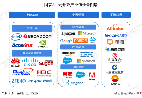 从产业结构来看,我国目前云计算产业链结构完备,上游为核心硬件(芯片、内存等)、IT基础设备(服务器、存储设备、网络设备等),中游为IaaS、PaaS、SaaS运营,下游为各类使用云的企业或组织。