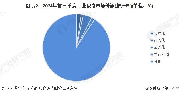 根据肥多多发布的数据,2024年前三季度,我国尿素产量累计4871.02万吨,结合上市公司公报披露数据,各公司市场份额具体如下所示: