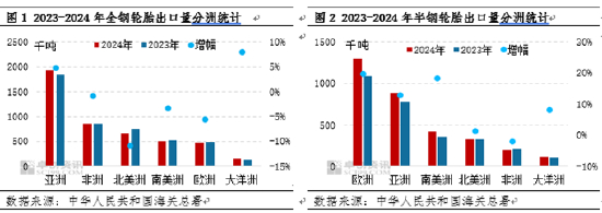 近年来,中国轮胎出口量继续保持了增长态势。随着美国对中国轮胎实施“双反”以及加征关税等政策,中国轮胎出口流向也随之发生变化,出口美国市场占比从40%的高位下滑到了目前的不足5%。中华人民共和国海关数据显示,2024年中国全钢轮胎出口量4589.34千吨,同比降幅0.67%;半钢轮胎出口量3255.40千吨,同比增长13.72%。