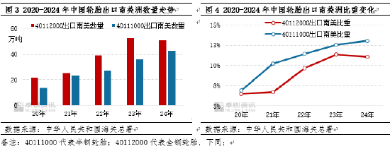 中华人民共和国海关数据显示,2021年中国全钢轮胎出口南美洲数量约25.49万吨;2024年出口数量提升至50.85万吨,增长翻倍;且出口南美洲在总出口量中的比重由6.8%提升至11.1%。与此同时,中国半钢轮胎在南美洲市场的出口量也呈现出较快增长趋势,2021年中国半钢轮胎出口南美洲数量约23.64万吨,2024年增加至42.49万吨,增幅高达79.74%;且比重由10.2%提升至13.1%。强劲的增长展示出中国轮胎在南美洲市场的强劲需求和增长潜力,同时也展示出中国轮胎在南美洲市场的份额正在逐步扩大,市场占有率也在不断增强。