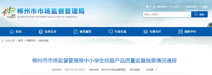 湖南省郴州市市场监督管理局通报中小学生校服产品质量监督抽查情况