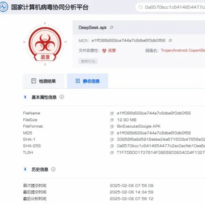 近日,国家计算机病毒应急处理中心和计算机病毒防治技术国家工程实验室依托国家计算机病毒协同分析平台在我国境内捕获发现仿冒DeepSeek官方App的安卓平台手机木马病毒。