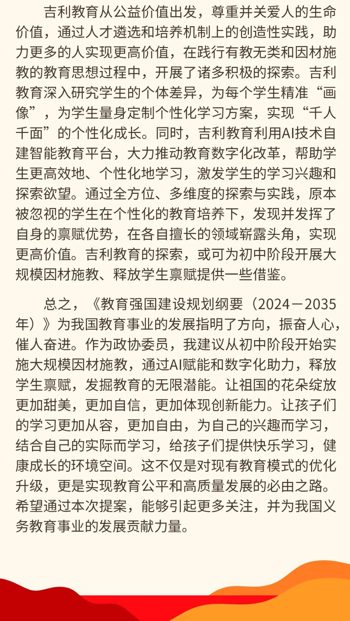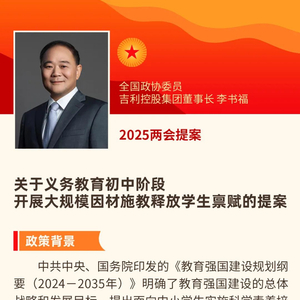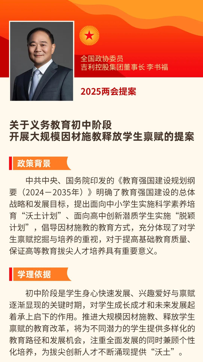李书福两会提案(一):关于义务教育初中阶段开展大规模因材施教释放学生禀赋的提案