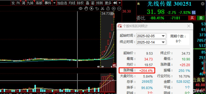 值得注意的是,自《哪吒2》上映,光线传媒股价表现强势,此前走出8天6板,开年以来累计涨幅超264%,市值暴增约720亿元,总市值一度突破千亿大关,创下影视股历史纪录。